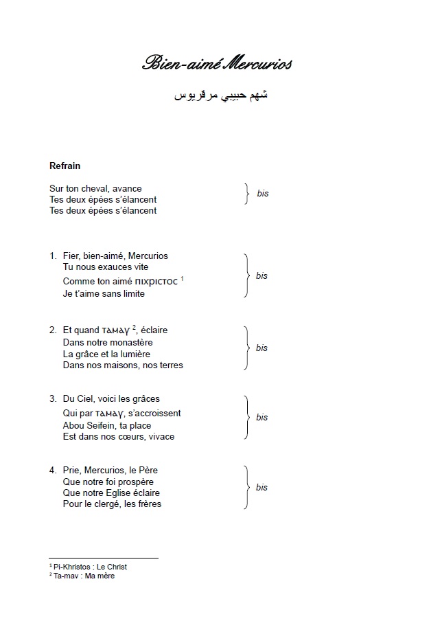 Fier bien-aimé Mercurios Tu nous exauces vite Comme ton aimé PiKhristos Je t'aime sans limite