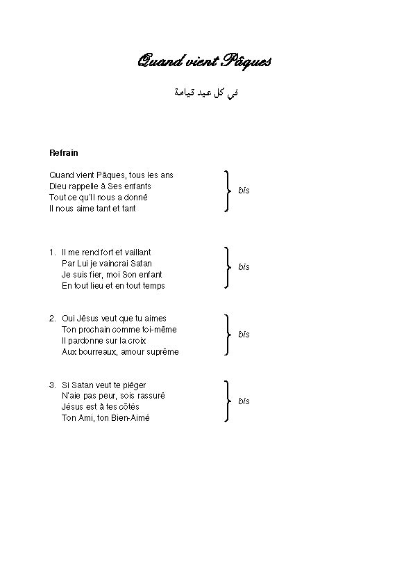 Quand vient Pâques tous les ans Dieu rappelle à Ses enfants Tout ce qu'Il nous as donné Il nous aime tant et tant