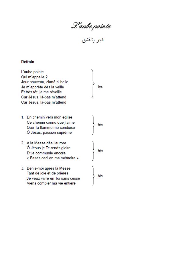 L'aube pointe Qui m'appelle Jour nouveau clarté si belle Je m'apprête dès la veille Et très tôt je me réveille Car Jésus là-bas m'attend